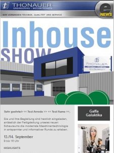Für die gesamte THONAUER-Gruppe (A, HU, RO, CZ, SK) übernimmt Lighthouse regelmäßig die Erstellung, den Aufbau und die Analyse der E-Mail-Newsletter. Die zielgerichtete Planung und Aufbereitung sowie die gut selektierten Adressen tragen dazu bei, dass Kunden und Interessenten von THONAUER regelmäßig zu relevanten Themen informiert werden. Die durchschnittliche Öffnungsrate beträgt derzeit bereits 25 %.